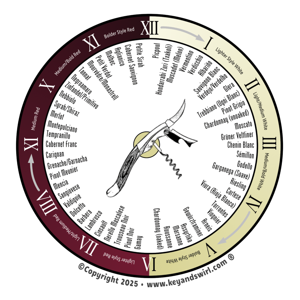 [Example: Cabernet Franc is a 9:00 wine and Malbec is just past 11:00.]